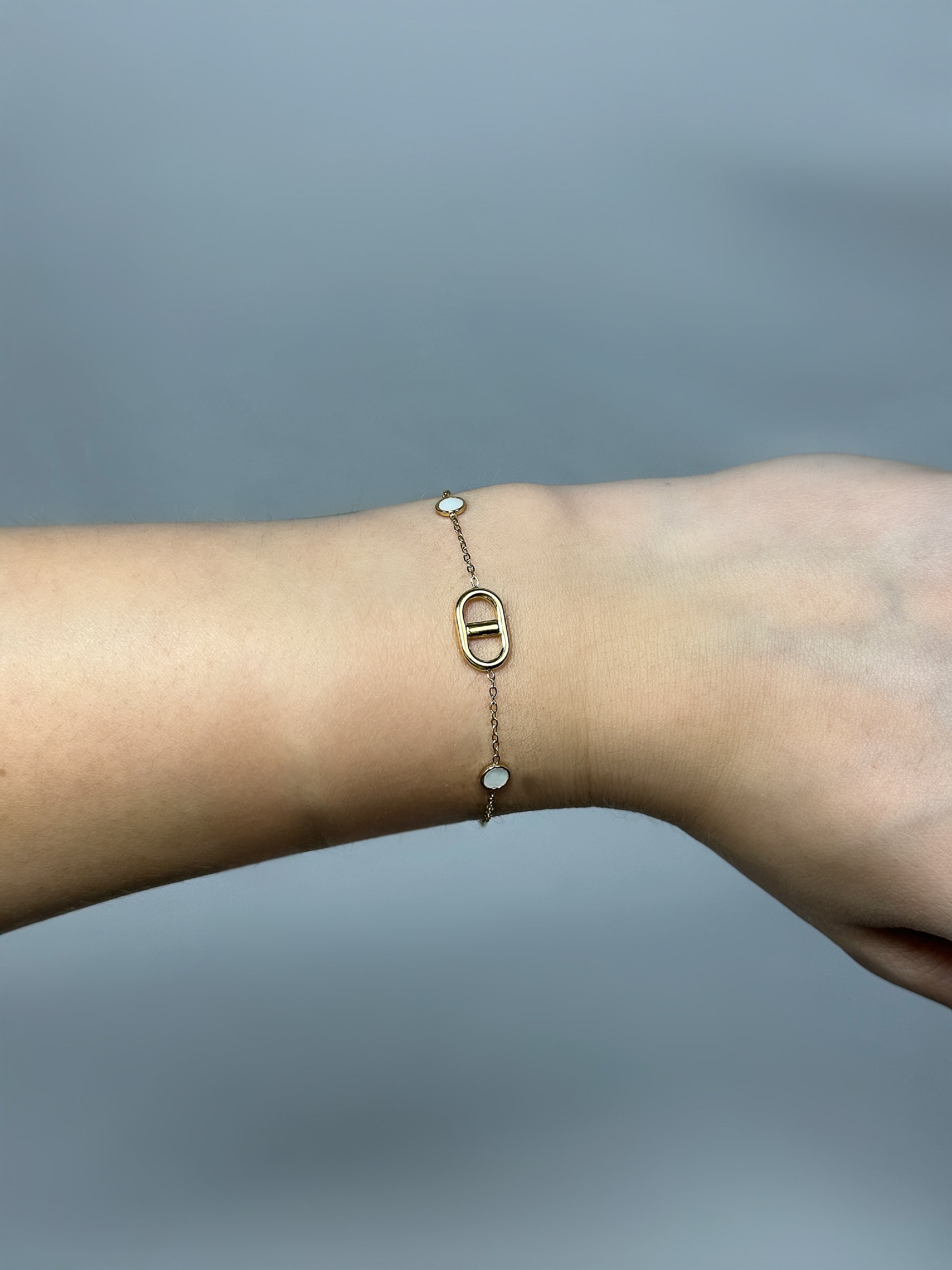 A fine 18K gold-tone chain wraps gracefully around the wrist, accented by a sculpted oval signature link and a single luminous stone for a touch of quiet shimmer. The balance of shape and light feels modern, refined, and unmistakably Épure.