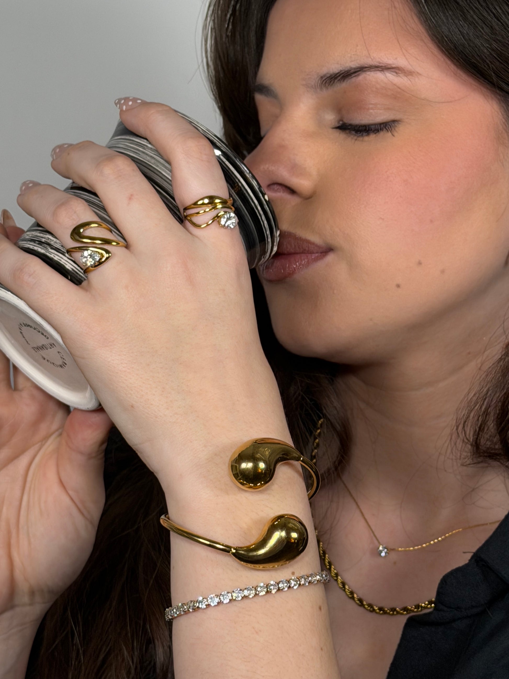 – Sculptural open-cuff design